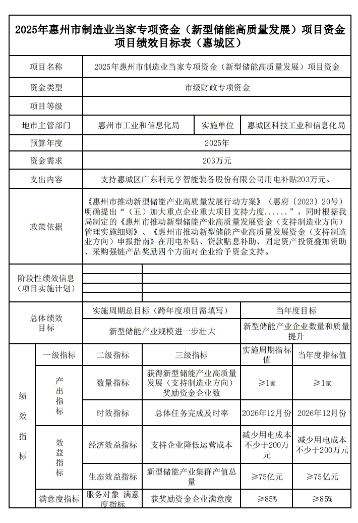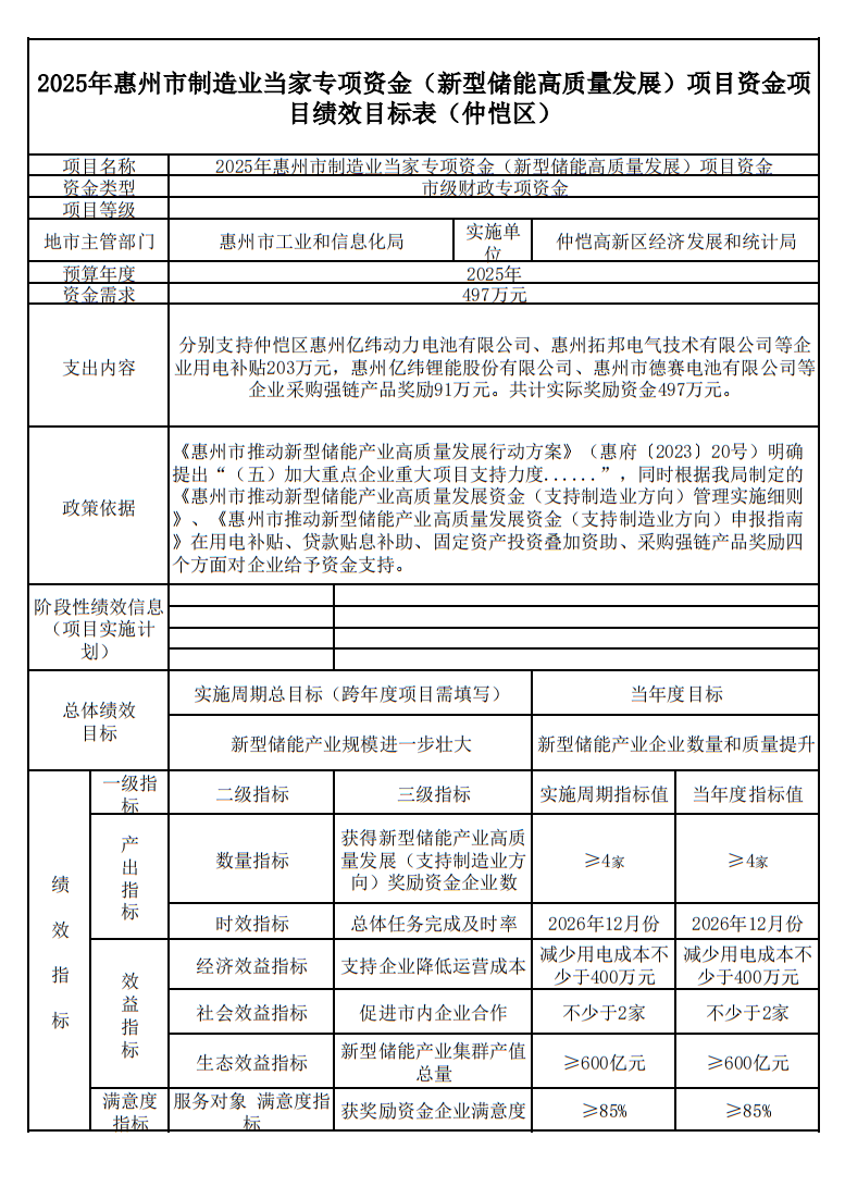 2.2025年惠州市制造業(yè)當家專項資金(新型儲能高質(zhì)量發(fā)展)績效目標表(惠城區(qū)、仲愷區(qū))