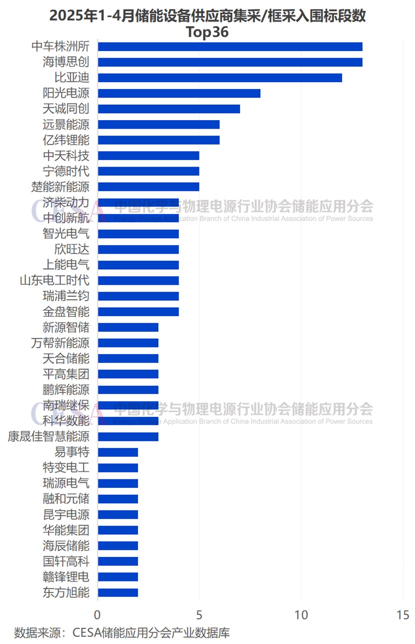 2025年1-4月,中電建、中核集團(tuán)、中廣核、華電集團(tuán)、國電投、華能集團(tuán)、中石油、尚威環(huán)境、三峽集團(tuán)、新風(fēng)光等多個(gè)企業(yè)儲(chǔ)能系統(tǒng)/電芯集采/框采招標(biāo)工作落地。由于多數(shù)儲(chǔ)能集采/框采項(xiàng)目未公布各中標(biāo)企業(yè)的具體分配占比,我們以入圍標(biāo)段數(shù)量作為主要分析對(duì)象。據(jù)CESA儲(chǔ)能應(yīng)用分會(huì)產(chǎn)業(yè)數(shù)據(jù)庫不完全統(tǒng)計(jì),1-4月共有18家企業(yè)入圍標(biāo)段數(shù)不低于4個(gè),其中,中車株洲所、海博思創(chuàng)和比亞迪儲(chǔ)能集采/框采入圍均超過10個(gè)標(biāo)段數(shù),表現(xiàn)尤為突出。