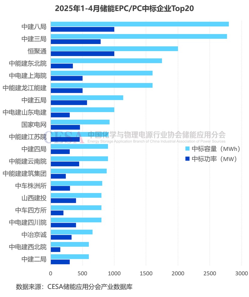 中電建在2025年1-4月儲(chǔ)能EPC/PC(含設(shè)備)中標(biāo)規(guī)模達(dá)2.49GW/6.52GWh,容量占比15.98%。