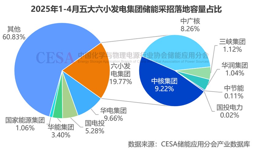 值得一提的是,電力央企是儲(chǔ)能需求的主要驅(qū)動(dòng)力之一。2025年1-4月,五大六小發(fā)電集團(tuán)儲(chǔ)能采招落地規(guī)模超50GWh,占比高達(dá)39.17%。其中,華電集團(tuán)、國電投、華能集團(tuán)、國家能源集團(tuán)等五大發(fā)電集團(tuán)采招落地規(guī)模共25.67GWh,占比19.40%;中核集團(tuán)、中廣核、三峽集團(tuán)、華潤電力等六小發(fā)電集團(tuán)采招落地26.15GWh,占比19.77%。
