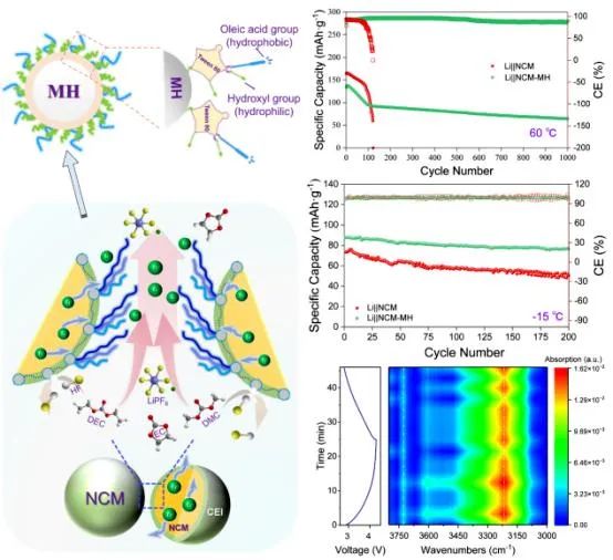 據(jù)悉,鋰離子電池的寬溫域性能,直接決定其在極端環(huán)境中的應(yīng)用表現(xiàn)。研究團(tuán)隊(duì)受自然界中動(dòng)物精子通過(guò)鞭毛擺動(dòng)改變自身周圍流場(chǎng)進(jìn)行移動(dòng)的現(xiàn)象啟發(fā),在鋰離子電池正極界面上進(jìn)行“烷基鏈搖曳”設(shè)計(jì),顯著促進(jìn)界面電解液流動(dòng),正極固態(tài)電解質(zhì)界面膜得以快速形成,在能夠及時(shí)抵御高溫下電解液對(duì)正極材料攻擊的同時(shí),加速低溫下高黏度電解液中的鋰離子傳輸,同步提升電池高低溫性能。