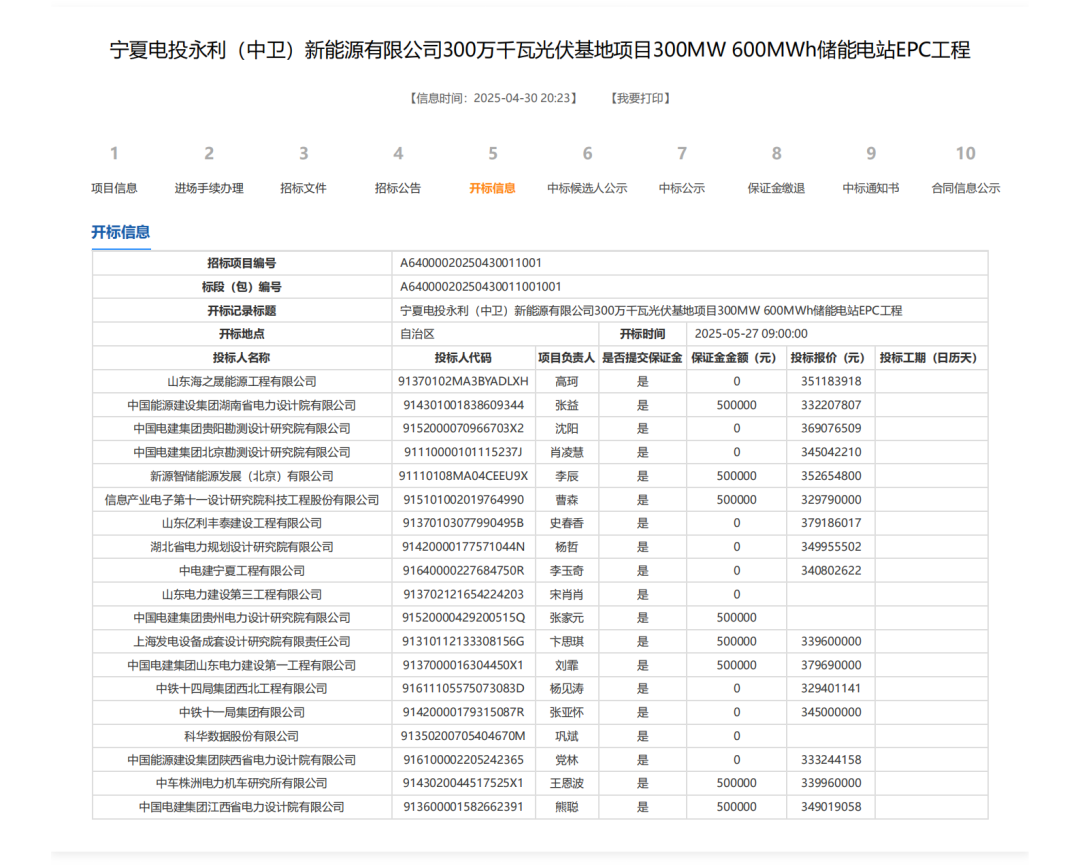 中國儲(chǔ)能網(wǎng)訊:5月27日,寧夏電投永利(中衛(wèi))新能源有限公司300萬千瓦光伏基地項(xiàng)目300MW/600MWh儲(chǔ)能電站EPC工程項(xiàng)目開標(biāo)。