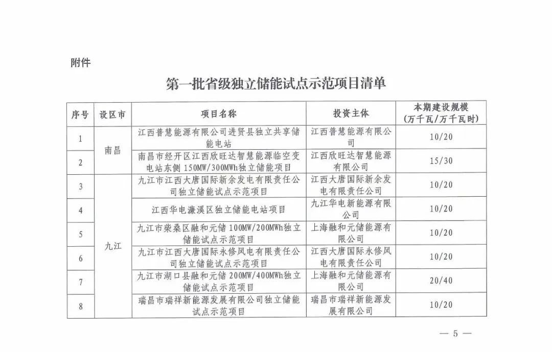 江西省能源局關于印發(fā)第一批省級獨立儲能試點示范項目清單的通知