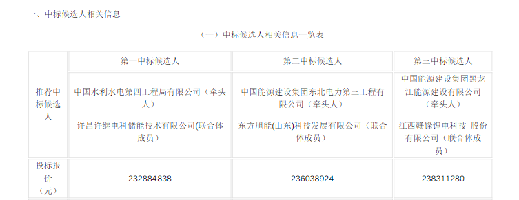 該項(xiàng)目建設(shè)規(guī)模為100MW/400MWh,最后共有6家企業(yè)以聯(lián)合體形式入圍,包括許繼電科、東方旭能、贛鋒鋰電等企業(yè),其中中國水利水電第四工程局有限公司、許昌許繼電科儲(chǔ)能技術(shù)有限公司以單價(jià)0.582元/Wh成為第一中標(biāo)候選人。