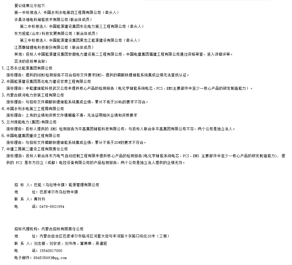 江蘇永達(dá)能源集團(tuán)有限公司因“提供的DEMS檢測(cè)報(bào)告不符合招標(biāo)文件要求EMS,提供的磷酸鐵鋰儲(chǔ)能系統(tǒng)集成業(yè)績(jī)無法查找認(rèn)證”而被廢標(biāo);中國能源建設(shè)集團(tuán)西北電力建設(shè)甘肅工程有限公司、中建三局第二建設(shè)工程有限責(zé)任公司因投標(biāo)聯(lián)合體“未提供核心產(chǎn)品的檢測(cè)報(bào)告”而被廢標(biāo);內(nèi)蒙古銀河電力安裝工程有限公司、中國電建集團(tuán)重慶工程有限公司均因?yàn)椤安环狭姿徼F鋰儲(chǔ)能系統(tǒng)集成業(yè)績(jī)累計(jì)不低于2GW的要求”而廢標(biāo);中國水利水電第三工程局有限公司則因?yàn)椤吧蟼鞯臉I(yè)績(jī)和資質(zhì)文件模糊看不清,無法證明相關(guān)業(yè)績(jī)和資質(zhì)要求”而廢標(biāo)。