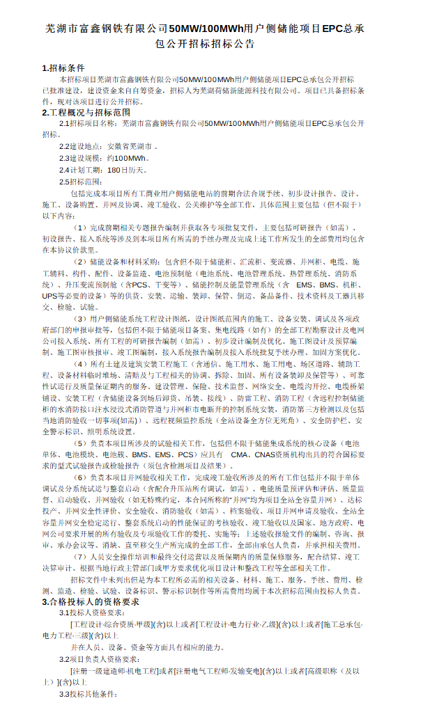 中國儲能網(wǎng)訊:5月27日,蕪湖市富鑫鋼鐵有限公司50MW/100MWh用戶側儲能項目EPC總承包公開招標招標公告發(fā)布。