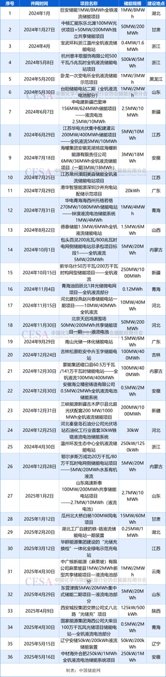 表 2024-2025年5月液流電池儲(chǔ)能并網(wǎng)項(xiàng)目