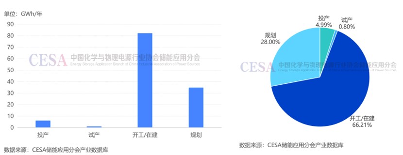 其中,新增投產(chǎn)項(xiàng)目2個(gè),投產(chǎn)年產(chǎn)能6.2GWh,占比4.99%,新增試產(chǎn)項(xiàng)目共1個(gè),共計(jì)1GWh,占比0.8%;新增開(kāi)工/在建項(xiàng)目23個(gè),規(guī)劃年產(chǎn)能82.28GWh,占比66.21%;新增規(guī)劃(含新增擬建/簽約/環(huán)評(píng)獲批等)項(xiàng)目共20個(gè),規(guī)劃年產(chǎn)能34.8GWh,占比28%。