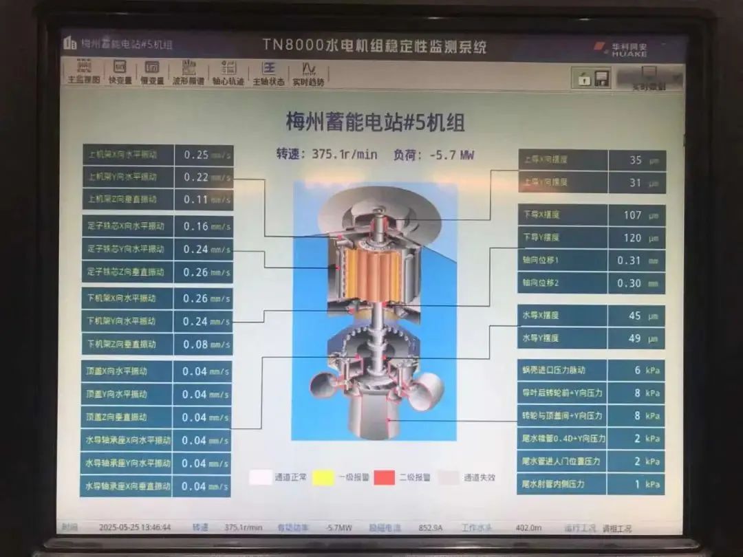5號(hào)機(jī)組于5月25日13點(diǎn)31分完成抽水調(diào)相并網(wǎng)試驗(yàn),試驗(yàn)過程中壓水時(shí)間、氣罐壓力、機(jī)組振擺、瓦溫,噪音等穩(wěn)定指標(biāo)全部滿足要求,機(jī)組運(yùn)行平順、各輔助設(shè)備運(yùn)行穩(wěn)定。