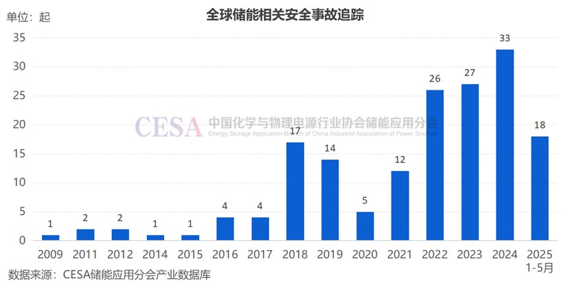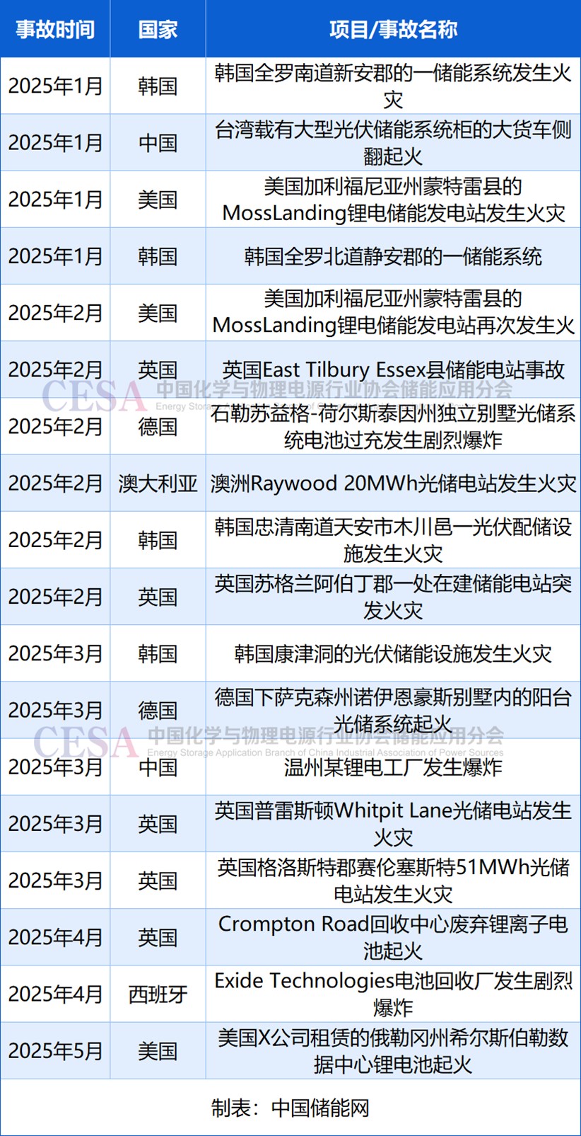 馬斯克X數(shù)據(jù)中心的火災(zāi)事件并非孤例,隨著全球能源轉(zhuǎn)型提速與儲(chǔ)能產(chǎn)業(yè)的迅猛擴(kuò)張,儲(chǔ)能相關(guān)事故發(fā)生頻率呈上升趨勢。據(jù)CESA儲(chǔ)能應(yīng)用分會(huì)產(chǎn)業(yè)數(shù)據(jù)庫不完全統(tǒng)計(jì),僅2025年1-5月,全球就新增了18起儲(chǔ)能相關(guān)安全事故,其中英國5起,韓國4起,美國3起,德國和中國各2起,澳大利亞、西班牙各1起。