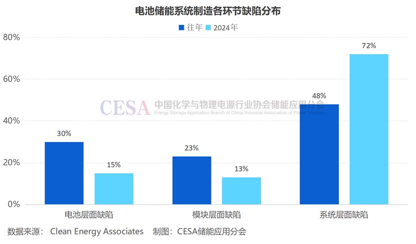 為有效遏制事故發(fā)生,我們須追根溯源,深入剖析各關(guān)鍵環(huán)節(jié)的質(zhì)量控制現(xiàn)狀。近日,美國Clean Energy Associates(CEA)發(fā)布了最新的BESS質(zhì)量風(fēng)險(xiǎn)報(bào)告,該報(bào)告覆蓋了包括美國、中國、印度、越南、韓國在內(nèi)的全球70余家BESS制造工廠。數(shù)據(jù)顯示,2024年所識(shí)別的質(zhì)量缺陷中,15%源自電芯制造,13%出現(xiàn)在模組制造環(huán)節(jié),而高達(dá)72%的問題則集中在系統(tǒng)集成層面,遠(yuǎn)高于往年48%的占比,系統(tǒng)集成正逐漸成為質(zhì)量控制的最大挑戰(zhàn)。
