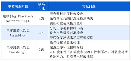 在電芯制造環(huán)節(jié),質(zhì)量問題主要集中在三個(gè)核心階段:40%的缺陷源于電極制造,39%出現(xiàn)在電芯組裝,另有21%發(fā)生于電芯封裝。其中,分切工序尤為值得關(guān)注,其缺陷發(fā)生率高達(dá)38%,為所有子工序中最高。該環(huán)節(jié)容易出現(xiàn)電極毛刺問題,一旦毛刺刺穿隔膜,極有可能引發(fā)熱失控,嚴(yán)重威脅電芯乃至整套儲(chǔ)能系統(tǒng)的安全性。