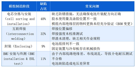 模組制造環(huán)節(jié)問題占比13%,由于其自動(dòng)化程度普遍低于電芯制造,因此更容易出現(xiàn)材料處理不精確及焊接質(zhì)量不佳的問題。其中,電芯分揀與安裝工序問題最為突出,占模組制造缺陷的48%。該環(huán)節(jié)涵蓋多個(gè)關(guān)鍵操作步驟,包括手動(dòng)和目視檢查外觀、清潔度、涂膠及夾具固定等。多數(shù)問題集中在涂膠環(huán)節(jié),例如涂膠區(qū)域不均勻或重量偏離標(biāo)準(zhǔn)操作規(guī)程(SOP)。