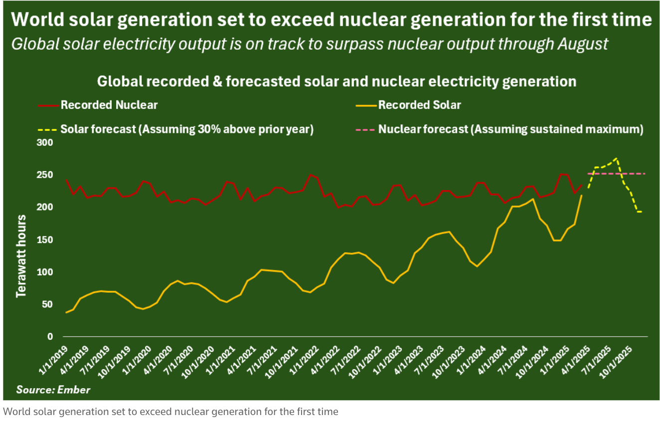 從總體裝機(jī)來(lái)看,2024年太陽(yáng)能的總裝機(jī)在所有主要發(fā)電來(lái)源中排名第三,僅次于煤炭的2174吉瓦和天然氣的2055吉瓦,但超過(guò)了水電的1283吉瓦和風(fēng)能的1132吉瓦。不斷增長(zhǎng)的太陽(yáng)能裝機(jī)推動(dòng)了每年太陽(yáng)能發(fā)電峰值達(dá)到歷史新高。Ember數(shù)據(jù)顯示,自2020年以來(lái),公用事業(yè)規(guī)模太陽(yáng)能發(fā)電量每年平均增長(zhǎng)25%。但在2025年的前三個(gè)月,太陽(yáng)能發(fā)電量比2024年同期增長(zhǎng)了34%,這得益于幾個(gè)關(guān)鍵地區(qū)發(fā)電能力的廣泛增長(zhǎng)。如果月度太陽(yáng)能發(fā)電量繼續(xù)比2024年同期增長(zhǎng)約30%,那么今年6月、7月和8月,全球太陽(yáng)能發(fā)電量每月應(yīng)超過(guò)260太瓦時(shí)(TWh)。這些發(fā)電量很可能輕松超過(guò)全球核電站的月度發(fā)電量,自2019年以來(lái),其月度發(fā)電量峰值略低于252太瓦時(shí),2024年平均每月發(fā)電量為223太瓦時(shí)。從9月開(kāi)始,隨著北半球(全球超過(guò)四分之三的太陽(yáng)能發(fā)電廠(chǎng)位于北半球)的日照時(shí)間開(kāi)始減少,太陽(yáng)能發(fā)電量可能會(huì)回落至250太瓦時(shí)以下。