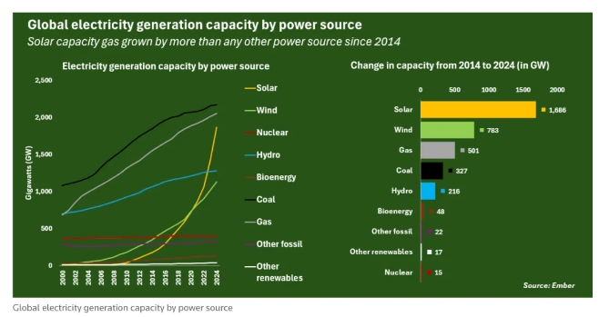 在過(guò)去十年中,公用事業(yè)公司在發(fā)電網(wǎng)絡(luò)中增加了兩倍多的太陽(yáng)能發(fā)電能力,超過(guò)了其他任何電力來(lái)源,這主要得益于太陽(yáng)能系統(tǒng)的相對(duì)低成本和快速連接時(shí)間。根據(jù)能源智庫(kù)Ember的數(shù)據(jù),截至2024年全球電力系統(tǒng)共有1866吉瓦(GW)的公用事業(yè)規(guī)模太陽(yáng)能發(fā)電能力。該裝機(jī)規(guī)模是2014年產(chǎn)能的10倍,在此期間,在所有主要電力來(lái)源中,太陽(yáng)能發(fā)電能力的增長(zhǎng)遠(yuǎn)遠(yuǎn)超過(guò)了其他任何主要電力來(lái)源。 在過(guò)去的十年中,風(fēng)能發(fā)電的產(chǎn)能增長(zhǎng)位居第二,增長(zhǎng)了3.2倍,而所有其他發(fā)電來(lái)源的裝機(jī)容量增長(zhǎng)均未超過(guò)兩倍。