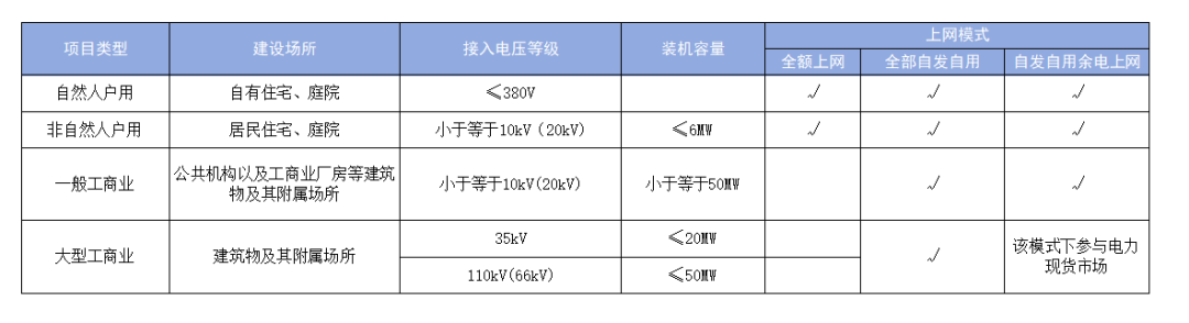 《管理辦法》將分布式光伏發(fā)電項目按照建設(shè)場所、接入電壓等級和裝機容量,細(xì)分為自然人戶用、非自然人戶用、一般工商業(yè)、大型工商業(yè)四種類型,全額上網(wǎng)、全部自發(fā)自用和自發(fā)自用余電上網(wǎng)三種上網(wǎng)模式。其中,自然人戶用、非自然人戶用分布式光伏項目三種上網(wǎng)模式可任選,一般工商業(yè)分布式光伏項目在全部自發(fā)自用、自發(fā)自用余電上網(wǎng)中二選一,大型工商業(yè)分布式光伏項目原則上選擇全部自發(fā)自用模式(在電力現(xiàn)貨市場連續(xù)運行地區(qū),大型工商業(yè)分布式光伏可通過自發(fā)自用余電上網(wǎng)模式參與現(xiàn)貨市場)。