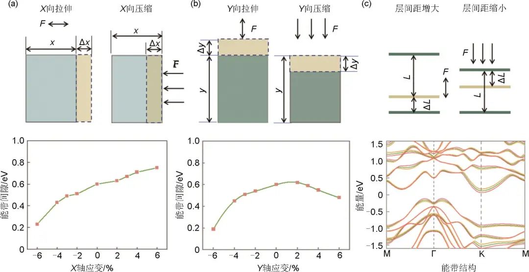 圖2 在橫向X軸、縱向Y軸、層間距Z軸等應力作用下雙層GeTe的能帶間隙變化