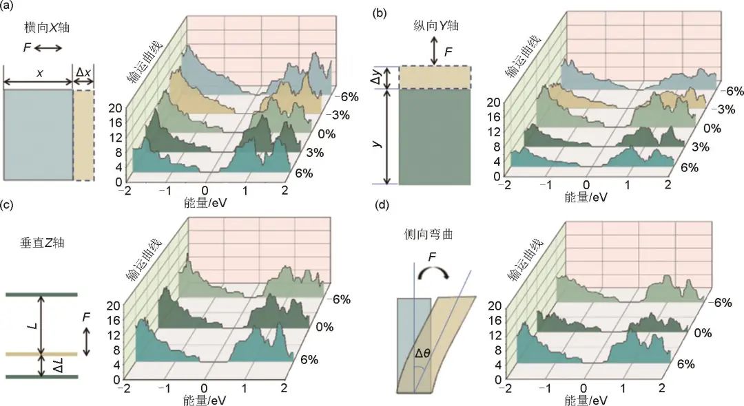 圖3 雙層GeTe熱電傳感器件在外部應力作用下的電子輸運特性曲線:(a) 橫向拉伸或壓縮(X);(b) 縱向拉伸或壓縮(Y);(c) 垂直層間距增大或縮小(Z);(d) 側(cè)向彎曲(θ)