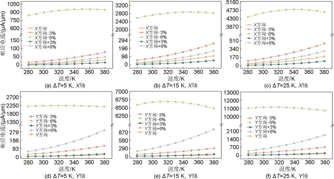 如圖4(a)和(d)所示,雙層GeTe在無偏置電壓條件下,僅利用電池內(nèi)部與外部冷卻液間的5 K溫差,熱電響應電流即可達到18.6 μA/μm,并且會隨著環(huán)境溫度的升高,傳感器件的敏感性也隨之提高。然而傳感器在水平面單軸應力壓縮6%時,熱電響應電流并未表現(xiàn)出顯著的正向相關關系,尤其是在Y軸應力作用下,如圖4(d)所示,隨著儲能電池溫度的增加而呈現(xiàn)出減弱的趨勢。這是由于隨著溫度的提高,器件受到聲子散射的作用阻礙了熱電響應電流進一步增強。其中,在應力壓縮6%條件下,器件費米能量附近輸運曲線峰間距縮短,促使熱電傳感器件響應電流整體提升顯著,性能幾乎是應力壓縮3%時的50倍。因此,為保證傳感器性能的穩(wěn)定性,設計時應避免受外部應力作用發(fā)生較大的形變,水平面單軸應力壓縮應控制在6%以內(nèi)。