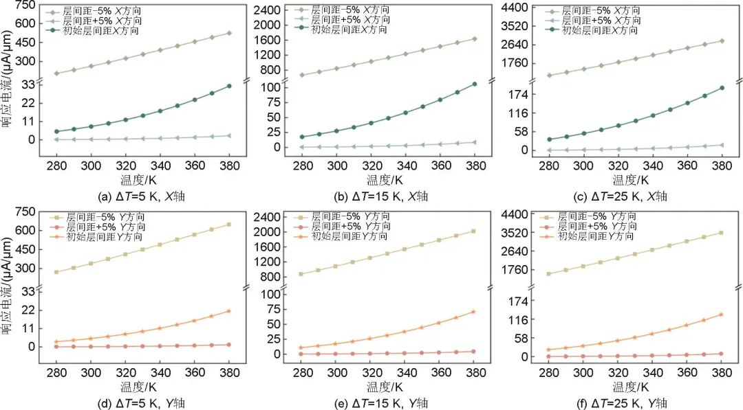 當雙層GeTe熱電傳感器件層間距方向上施加了致使層間距增大(縮短)5%的應力形變時,熱電響應電流隨儲能電池內(nèi)部溫度的增大呈線性增加趨勢。電池內(nèi)外溫差擴大至15 K和20 K時,線性關系僅存在細微的差異。如圖5所示,Z軸層間距增加5%會導致雙層GeTe熱電器件在相同環(huán)境溫度與?T下的響應電流擴大超10倍,而相較于Z軸層間距縮小5%,雙層GeTe熱電器件在相同環(huán)境溫度與?T下的響應電流顯著縮小,且隨環(huán)境溫度的變化而幾乎無明顯改變。相較而言,層間間距對于器件性能的影響較為顯著,因此,傳感器在Z軸方向的封裝工藝至關重要。值得注意的是,在熱失控初期的第二階段,電池內(nèi)部壓力增加顯著,但低緯半導體GeTe層間存在強的范德華作用力,表現(xiàn)出較大Z軸彈性系數(shù),因此在合理封裝設計條件下Z軸應力對于電池早期熱失控安全預警性能影響較弱。