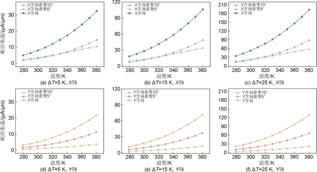 如圖6所示,雙層GeTe熱電器件在X方向和Y方向發(fā)生曲變,同軸向的熱電響應電流會隨著溫度的升高而升高,且曲變后的響應信號較同環(huán)境溫度與?T條件下未曲變時明顯下降。圖6(a)~(c)顯示,X軸向發(fā)生曲變時,曲變5°、10°時對GeTe熱電器件熱電響應結(jié)果的影響差別不大,而圖6(d)~(f)則表示Y軸發(fā)生曲變時,10°的曲變誘導GeTe熱電器件Y軸的熱電流發(fā)生更大程度的削減??傮w而言,X方向和Y方向的曲變應力會使雙層GeTe熱電器件同軸向熱電響應曲線在不同的溫度區(qū)間呈現(xiàn)差異化的變化率。當電池內(nèi)部溫度處于熱失控第二階段,傳感器的溫差為25 K時,在曲線應力作用下響應電流依然是其在正常工作條件下的5倍以上,可實現(xiàn)儲能電池內(nèi)部微觀“不可逆反應”精準判別。