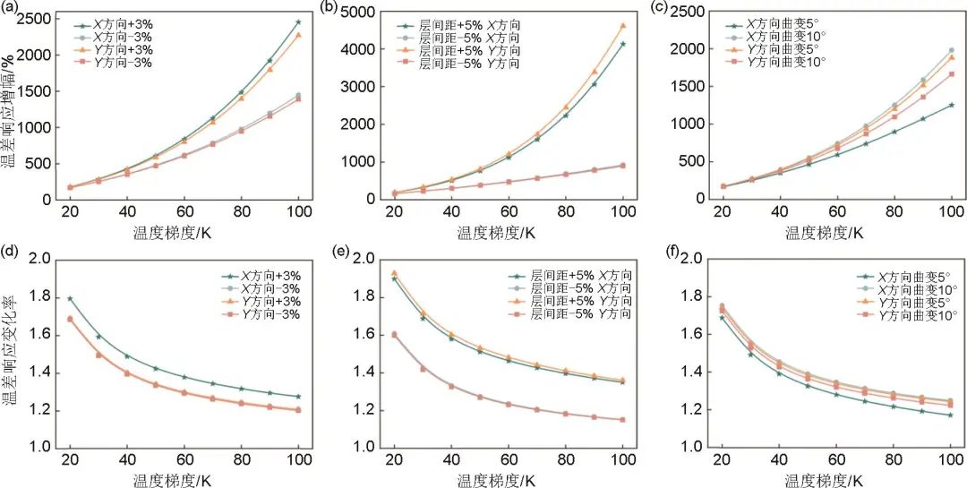 為進一步分析雙層GeTe熱電傳感器件在電池內(nèi)部受不同應力條件下的靈敏性與穩(wěn)定性,如圖7(a)~(c)所示,通過對比不同溫度差的熱電響應電流相較于在?T=10 K時的增幅比率發(fā)現(xiàn),當環(huán)境溫度相同時,熱電器件的兩端溫差升高會導致熱電響應電流增加。圖7(a)顯示,X與Y軸向3%的拉伸對GeTe熱電傳感器件的響應特性的影響相近,X與Y軸向3%的壓縮對GeTe熱電傳感器件的響應特性的影響也相近,且拉伸后的響應電流會增加,但拉伸或壓縮后,熱電響應電流均未與溫差呈現(xiàn)顯著線性關系。圖7(b)中,層間距增加5%會使熱電材料的熱電流顯著高于層間距減少5%時的熱響應電流,但不同軸向的響應電流差別并不顯著。為了更加顯著地突出溫差對熱電材料的熱電響應的影響,本工作將10 K溫差設定為一個溫度梯度,如圖7(d)~(f)所示,對比不同溫度梯度下熱電材料響應電流的變化率。結(jié)果表明,在軸向應力、層間距變化、曲變應力作用下,隨著溫差的增高,響應電流的梯度增大幅度逐漸下降。X軸的應力改變相較于Y軸的應力改變會增加熱電器件響應電流的梯度增大幅度。而如圖7(e)所示,層間距增加5%時響應電流的梯度增大幅度較層間距減少5%時明顯升高。綜上所述,雙層GeTe微型熱電傳感器可利用電池內(nèi)部與外部的溫度差開展熱失控全過程內(nèi)部溫度監(jiān)控,在熱失控早期快速阻斷電池鏈式反應,保障電站安全運行。
