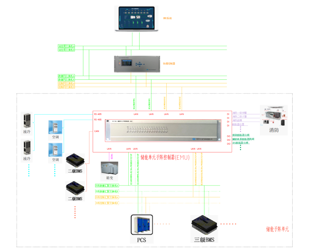 儲能單元子陣控制器(EMU)是儲能系統(tǒng)中負(fù)責(zé)對儲能單元子陣進(jìn)行監(jiān)測、控制和管理的關(guān)鍵設(shè)備,是提升儲能系統(tǒng)效率、安全性與經(jīng)濟(jì)性的核心樞紐。在保障儲能系統(tǒng)安全、穩(wěn)定、高效運行方面發(fā)揮著重要作用。儲能單元子陣控制(EMU)設(shè)計兼顧實時性、可靠性與靈活性,適應(yīng)復(fù)雜多變的能源管理需求。