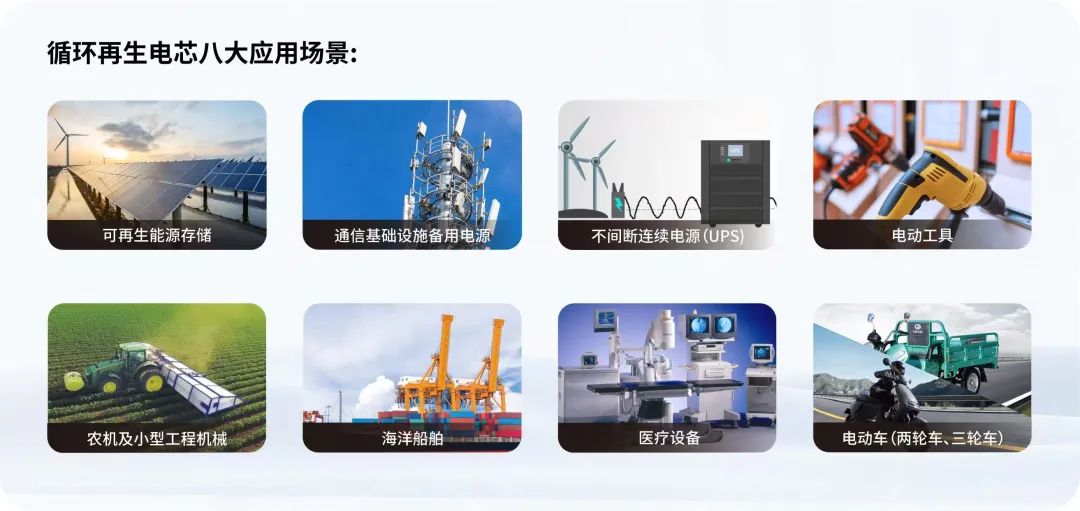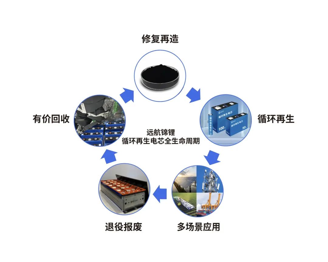 遠(yuǎn)航錦鋰與上下游開(kāi)展深度的技術(shù)合作,構(gòu)建了覆蓋電芯設(shè)計(jì)、電芯生產(chǎn)、電池使用、退役回收的循環(huán)再生體系:依托“智能拆解-無(wú)損剝離-有價(jià)回收”的產(chǎn)業(yè)技術(shù)鏈,將退役報(bào)廢電芯或極片中的正極材料、負(fù)極材料、電解液等成分進(jìn)行高效分離,并創(chuàng)新性運(yùn)用材料重構(gòu)技術(shù),將回收材料應(yīng)用到性能穩(wěn)定的循環(huán)再生電芯。這些循環(huán)再生電芯已廣泛應(yīng)用于小動(dòng)力、可再生能源儲(chǔ)能電站、通信基站備用電源、數(shù)據(jù)中心不間斷連續(xù)電源、農(nóng)業(yè)機(jī)械及電動(dòng)工具等場(chǎng)景。
