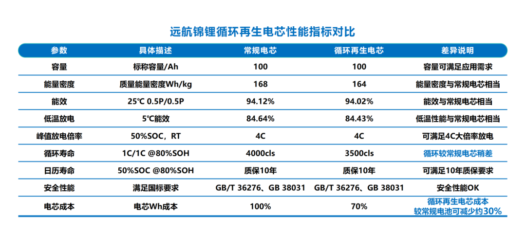 遠(yuǎn)航錦鋰循環(huán)再生電芯,在性能上與常規(guī)電芯持平,成本優(yōu)勢(shì)顯著。以100Ah電芯為例,其能量密度、能量效率、安全可靠性、壽命等核心指標(biāo)滿(mǎn)足國(guó)標(biāo)及使用場(chǎng)景要求,與常規(guī)電芯表現(xiàn)一致。電芯成本可大幅度降低(約30%),實(shí)現(xiàn)性能與性?xún)r(jià)比的雙重突破。