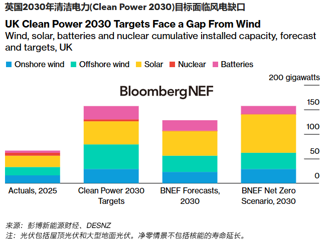 到2030年實(shí)現(xiàn)凈零電力系統(tǒng)需要大量新增風(fēng)電和光伏裝機(jī)。鑒于目前光伏滲透率相對(duì)較低,彭博新能源財(cái)經(jīng)預(yù)測(cè),英國將實(shí)現(xiàn)2030年清潔電力(Clean Power 2030)目標(biāo)中設(shè)定的47-50GW光伏裝機(jī)的目標(biāo)。然而,無論是陸上風(fēng)電還是海上風(fēng)電,英國都無法實(shí)現(xiàn)目標(biāo)。彭博新能源財(cái)經(jīng)的預(yù)測(cè)顯示,海上風(fēng)電與政府目標(biāo)之間存在10GW的缺口,陸上風(fēng)電則存在4GW的缺口。