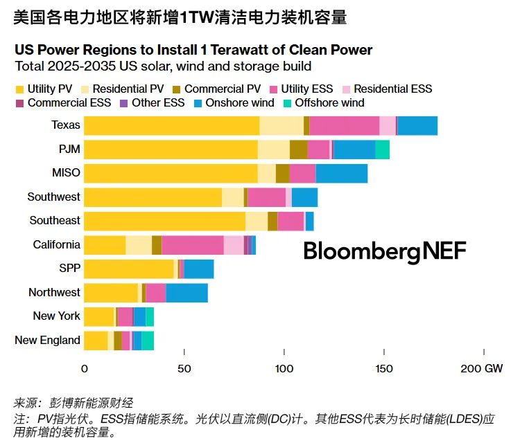 彭博新能源財(cái)經(jīng)預(yù)計(jì),希望獲得更多燃?xì)獍l(fā)電的電網(wǎng)(如PJM、MISO、SPP和德克薩斯州)還將在2025-2035年間新增總計(jì)538GW的光伏、風(fēng)電和儲(chǔ)能裝機(jī)。在所有這些市場(chǎng)中,光伏都在快速增長(zhǎng),因?yàn)樗钸m合滿足關(guān)鍵的夏季需求。