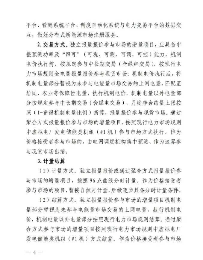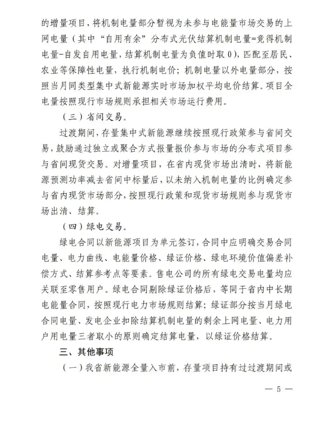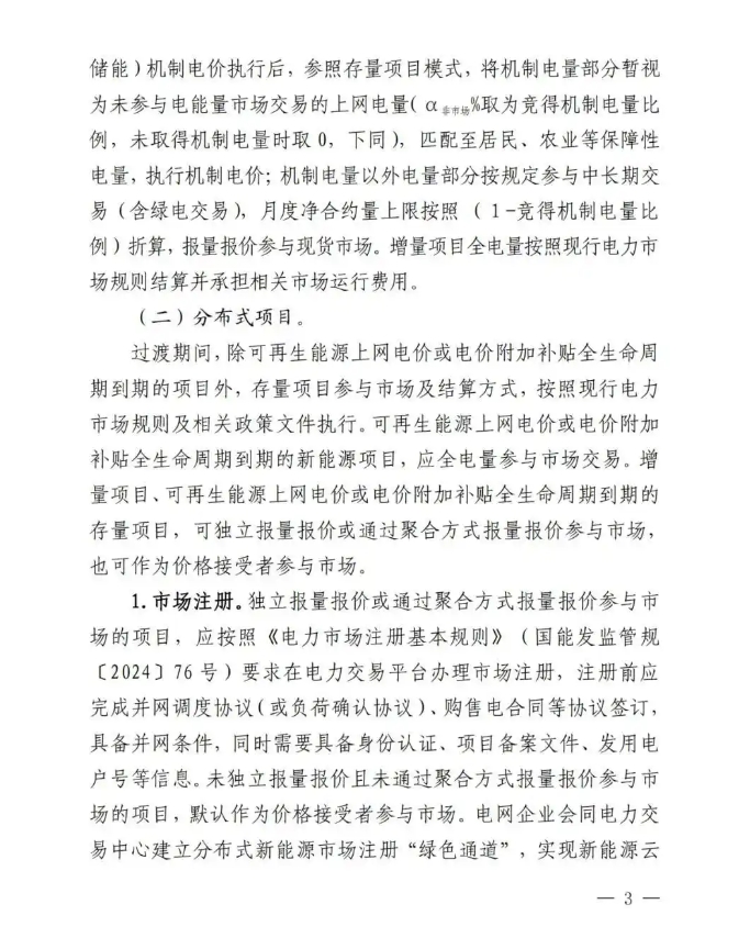 在機(jī)制電價(jià)執(zhí)行前,按規(guī)定參與中長(zhǎng)期交易(含綠電交易),按現(xiàn)行電力市場(chǎng)規(guī)則全電量報(bào)量報(bào)價(jià)參與現(xiàn)貨市場(chǎng)。