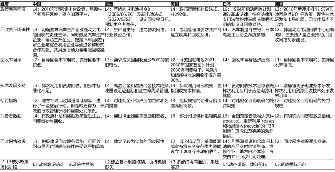 表1 中國與其他國家在廢動力電池管理7個維度上的政策演進(jìn)階段(截至2024年)