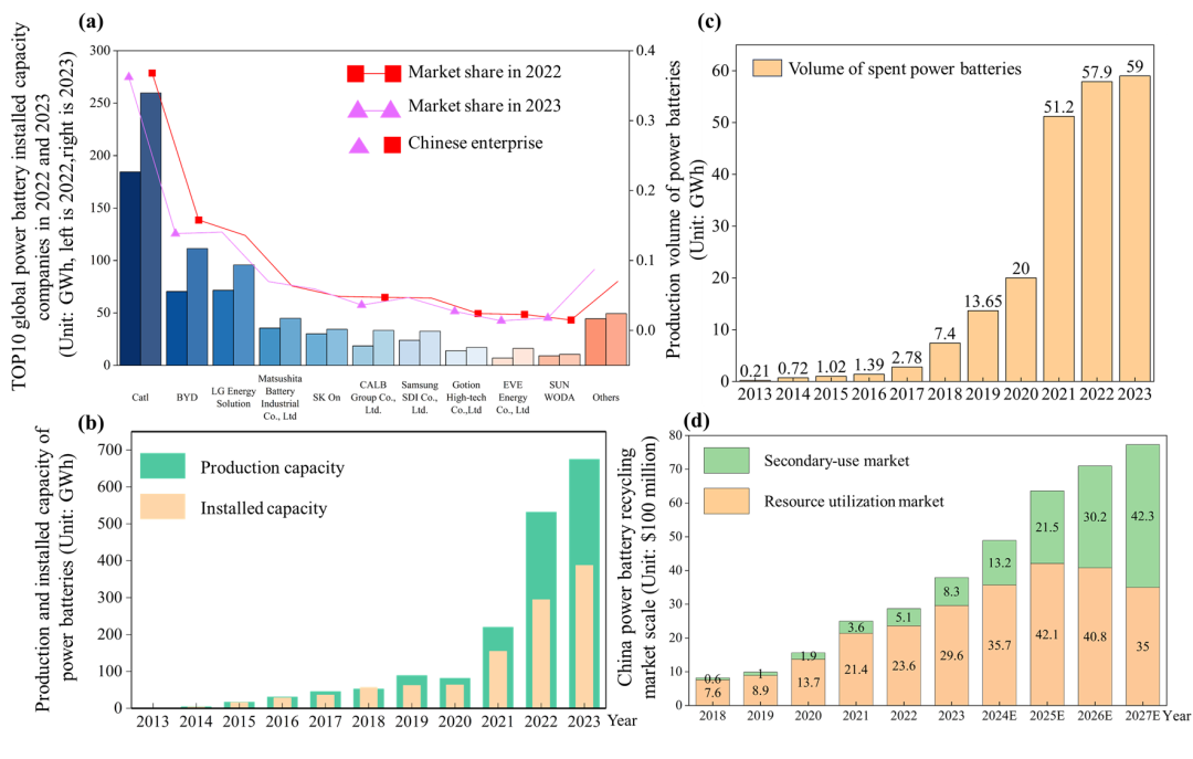 圖3 中國動力電池回收市場規(guī)模。(a)表示全球動力電池裝機(jī)量Top10的情況(單位:GWh)。其中有方塊和三角形標(biāo)記的是中國企業(yè)。(b)表示2013-2023年中國動力產(chǎn)能、電池裝機(jī)量;(c)表示中國2013-2023年退役動力電池預(yù)估產(chǎn)生量。(d)表示2018-2027年中國動力電池梯次利用和回收利用市場規(guī)模預(yù)測值