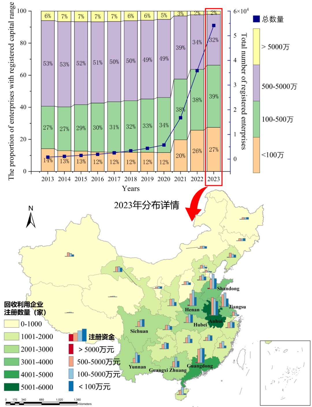 圖4 2013 - 2023年中國大陸動力電池回收企業(yè)數(shù)量、注冊資本占比、及2023年各省回收企業(yè)分布情況