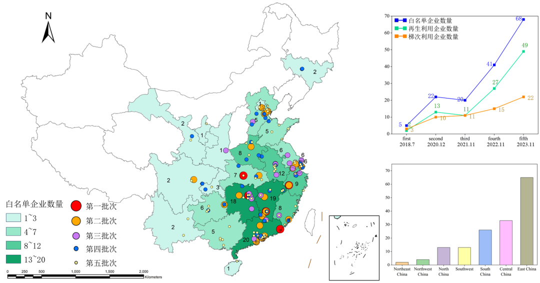 圖6 官方發(fā)布的動力電池白名單回收企業(yè)在中國大陸的分布地圖。(a)為中國工信部發(fā)布的各批次白名單回收企業(yè)的地理位置;(b)表示每個批次中業(yè)務(wù)類型的數(shù)量;(c)表示中國大陸各地區(qū)經(jīng)認(rèn)證的回收企業(yè)總數(shù)
