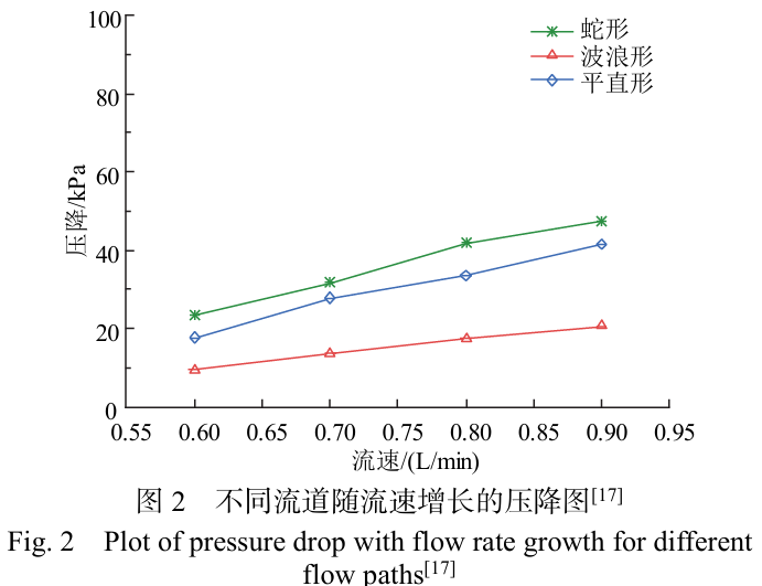 式中:Wp為泵功率,W;V為體積流量,cm3/s;ΔP為壓降,Pa;R為熱阻,K/W;函數(shù)表示熱阻隨泵功率變化曲線下的面積。結(jié)果表明,64流道的歧管綜合性能表現(xiàn)最好。但目前分歧管制造難度大,選擇平直形微通道改良的結(jié)構(gòu)較為實(shí)用,因此OSMAN等研究了蛇形、波浪形和平直形微通道冷板的冷卻效果,結(jié)果表明蛇形的冷卻效果提升最顯著,相比平直形的熱阻降低了10.5%,而波浪形熱阻相比平直形降低了8.3%。不同形式的微通道壓降如圖2所示,可見波浪形流道具有最低的壓降,具有最優(yōu)的綜合性能。ZHANG等對(duì)針翅形微通道進(jìn)行了研究,結(jié)果發(fā)現(xiàn)交錯(cuò)翅片具有最優(yōu)的性能,相比平直翅片溫度降低了6.75%,壓降還降低了13.33%, 具有較高的實(shí)用價(jià)值。RONG等針對(duì)仿生形(蛛網(wǎng)形)微通道冷板進(jìn)行流動(dòng)傳熱特性研究,結(jié)果表明蛛網(wǎng)形微通道中心角對(duì)傳熱性能影響不大,而通道寬度與通道間距的比值對(duì)傳熱性能有顯著影響。 因此應(yīng)重點(diǎn)針對(duì)通道寬度和通道間距進(jìn)行優(yōu)化。