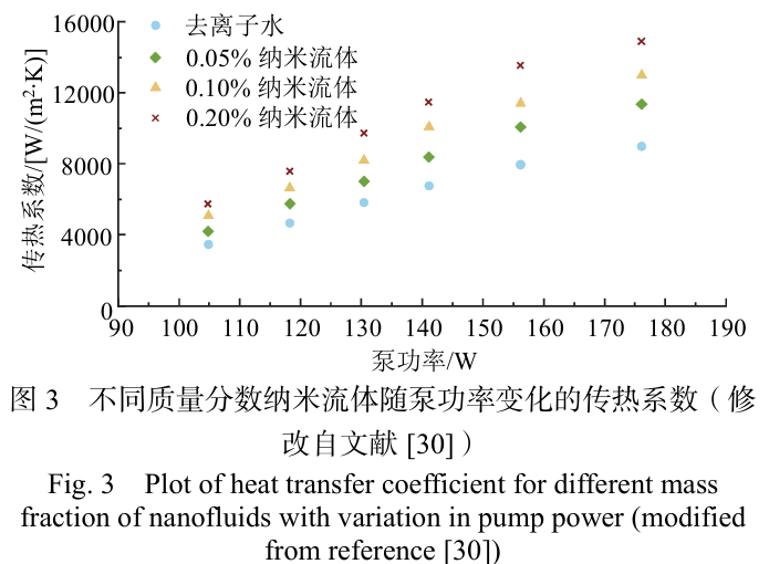 HOANG等通過(guò)實(shí)驗(yàn)測(cè)定不同流體介質(zhì)的熱力性能和水力性能,將乙二醇加入水中,熱力性能無(wú)明顯變化,但乙二醇的黏度導(dǎo)致水?乙二醇溶液的壓降為20.1kPa,比純水的5.8kPa高,而水和水?乙二醇混合液的熱力性能比介電冷卻劑Novec 7000 HFE高。HO等在水中加入氧化鋁納米顆粒,形成質(zhì)量分?jǐn)?shù)為8%的納米流體,在熱源密度為6.8W/cm2時(shí), 傳熱性能比純水提高了40%,且隨著流速增加,品 質(zhì)因數(shù)(figure of merit, FOM)達(dá)到了1.27,平均傳 熱效率提高了40%,盡管增加了傳熱性能,同時(shí)也增加了流動(dòng)阻力,綜合起來(lái)使用納米顆粒依舊是有效的。但納米顆粒長(zhǎng)時(shí)間使用后會(huì)團(tuán)聚導(dǎo)致流道堵塞,MASHALI等在去離子水中添加納米金剛石顆粒,如圖3所示,使用體積分?jǐn)?shù)φ=0.2%的納米金剛石顆粒溶液傳熱系數(shù)比去離子水提升69%,而且可靠性分析表明納米金剛石顆粒流體可以在兩年內(nèi)保持物理性質(zhì)的穩(wěn)定,具有重要的市場(chǎng)意義。