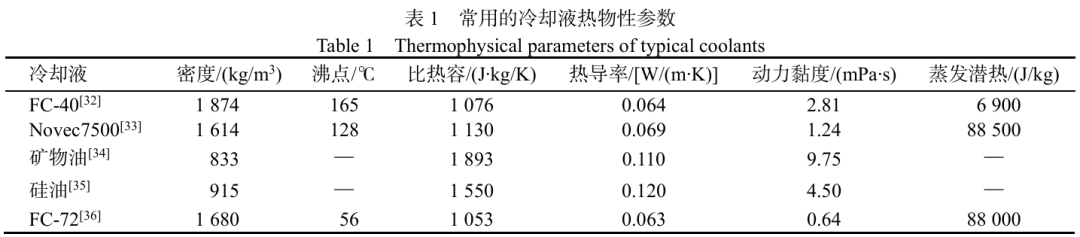 浸沒(méi)式液冷可以有效地去除電子元件產(chǎn)生的熱量,主要是由于電子元件浸入冷卻液中,產(chǎn)生的熱量直接被液體吸收并排出外界冷卻,因此能吸收的熱量較多。浸沒(méi)式液冷分為單相浸沒(méi)式液冷和兩相浸沒(méi)式液冷,主要區(qū)別在于冷卻液在吸收熱量的過(guò)程中有無(wú)發(fā)生相變。影響浸沒(méi)式液冷的冷卻性能關(guān)鍵在于使用的工質(zhì),表1為典型的冷卻液熱物性參數(shù)。