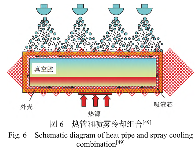 大量科研人員針對(duì)噴頭和噴霧方式進(jìn)行優(yōu)化, 已經(jīng)取得了顯著成果。ZHAO等開發(fā)了噴霧冷卻結(jié)合均熱板的冷卻裝置,圖6為系統(tǒng)原理圖。研究結(jié)果表明,熱流密度為20~40 W/c㎡時(shí),在噴霧流量為1.63L/min及噴頭壓力為0.4MPa條件下,熱管和噴霧冷卻的綜合傳熱性能最佳,此時(shí)熱管熱阻為0.0469K/W、熱導(dǎo)率為2371.77W/(m·K)、噴霧傳熱系數(shù)高達(dá)168.4kW/(㎡·K)。YANG等利用數(shù)值模擬研究噴霧冷卻的傳熱性能和熱均勻性,熱源設(shè)定為恒溫?zé)嵩?,?duì)不同噴頭高度和角度下的噴霧冷卻性能作對(duì)比,研究發(fā)現(xiàn)在噴霧壓力1 015.3kPa時(shí),4mm噴頭高度的熱流密度最高,此時(shí)液膜流動(dòng)速度最快,蒸發(fā)最劇烈;減小噴頭角度并增加噴頭高度可提高傳熱量,切線高度越高,則相應(yīng)的傳熱量越大,當(dāng)θ=30°,高度為27.59mm時(shí),最大熱通量達(dá)到103.17W/c㎡,且有效改善溫度均勻性;而采用噴射陣列冷卻的熱均勻性最好,這是由于液滴的覆蓋范圍最大,且噴射強(qiáng)度最均勻。KANDASAMY等開發(fā)了新型噴霧冷卻系統(tǒng),旨在消除5.6kW的熱負(fù)荷,隨著噴嘴流量增加,加熱器表面溫度下降6.3℃,熱阻下降0.2℃/W。