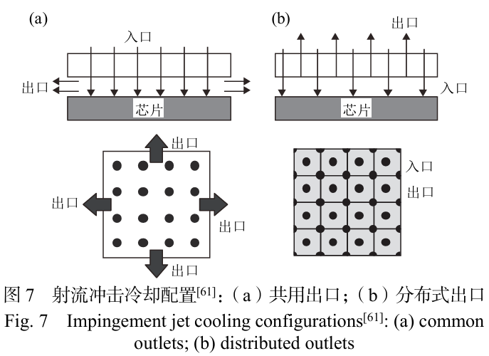 射流沖擊冷卻是一種利用高速流體沖擊固體表面以產(chǎn)生強(qiáng)烈換熱效果的方式。相比噴霧式液冷, 其最大的特點(diǎn)是無(wú)需對(duì)液體霧化。目前射流沖擊的研究主要集中在對(duì)射流的噴嘴形狀進(jìn)行改良以提高傳熱性能。MIRA-HERNáNDEZ等以半經(jīng)驗(yàn)?zāi)P蜑榛鶞?zhǔn),開發(fā)了用于預(yù)測(cè)射流陣列沖擊的相變傳熱方程,在噴射流速為1~4m/s時(shí),經(jīng)過(guò)驗(yàn)證平均絕對(duì)百分比誤差為3.88%。SHIN等采用HFE-7000進(jìn)行微尺度的射流沖擊熱傳遞機(jī)制研究,在出口雷諾數(shù)達(dá)4057時(shí),可以有效冷卻熱通量為80W/c㎡的芯片,同時(shí)得到了微尺度下的冷卻熱傳遞機(jī)制。MANGATE等發(fā)現(xiàn)帶中心孔的射流沖擊可以降低熱阻,相比不帶中心孔的射流沖擊提高25%,且相同射流頻率下,使用散熱器能使傳熱系數(shù)提高6倍。LIN等對(duì)射流沖擊的散熱器進(jìn)行優(yōu)化,提出優(yōu)化散熱器應(yīng)增加翅片,減少翅片的內(nèi)徑,當(dāng)流速為0.848/min時(shí),散熱器的熱阻僅為0.07℃/W。WEI等研究了分布式出口的射流沖擊冷卻,原理如圖7所示,對(duì)熱流密度為37.5W/c㎡的芯片進(jìn)行研究,并成功擬合出了傳熱關(guān)聯(lián)式,最大誤差不 超過(guò)30%,并且發(fā)現(xiàn)了噴嘴入口直徑對(duì)傳熱性能影響最大,但噴嘴長(zhǎng)度和直徑對(duì)壓降影響最大。