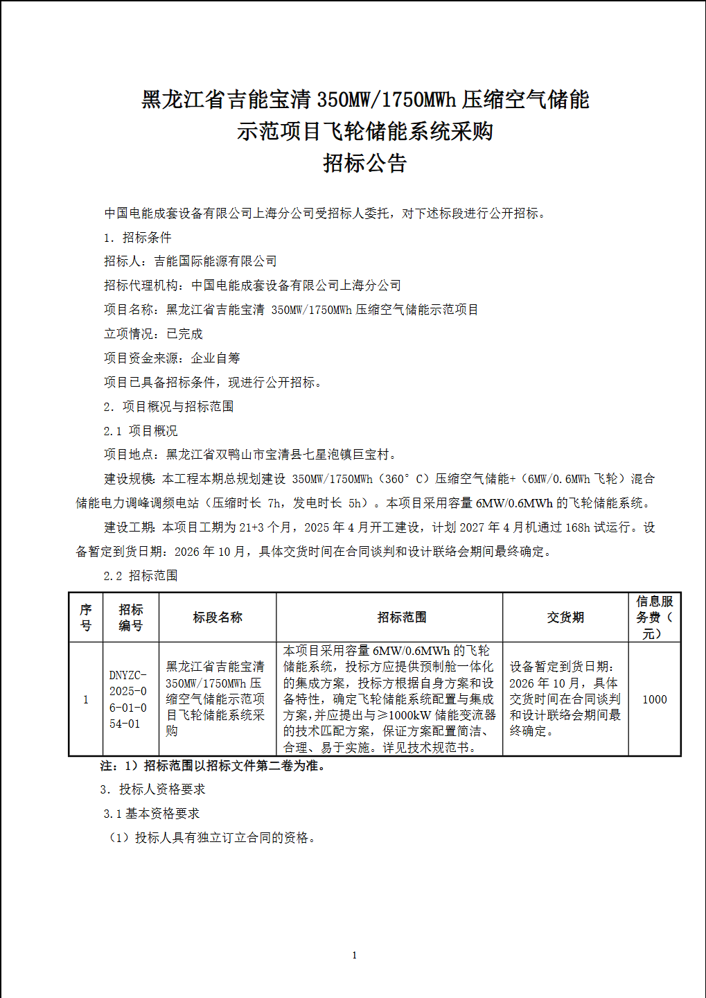 350MW/1750MWh!黑龍江寶清壓縮空氣儲(chǔ)能示范項(xiàng)目飛輪儲(chǔ)能系統(tǒng)采購(gòu)招標(biāo)公告