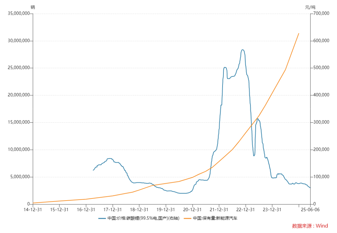 “鋰價(jià)自2022年高點(diǎn)以來(lái)逐步回歸理性,在供給逐步釋放和需求增速放緩的背景下,鋰價(jià)逐步尋底,目前已接近上一輪低點(diǎn)?!?025年6月3日,浙商證券分析師沈皓俊在其研究報(bào)告中表示,鋰行業(yè)經(jīng)過(guò)三年多調(diào)整,已進(jìn)入“底部”區(qū)間。