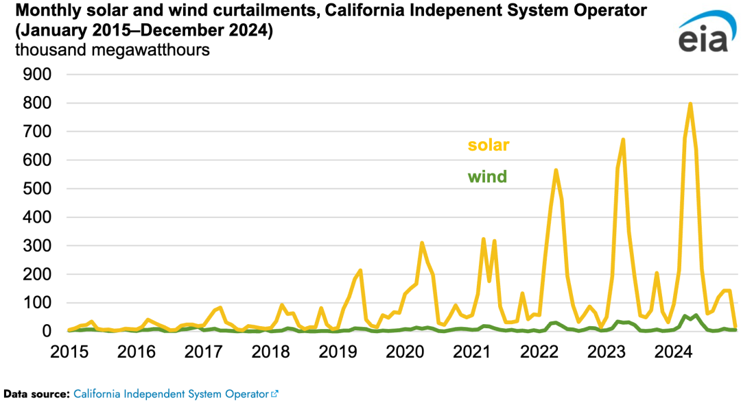 中國儲能網訊:據美國能源信息署 (EIA)的數據,加州獨立系統(tǒng)運營商(CAISO,負責加州大部分地區(qū)的電網運營)在平衡供需的同時,隨著可再生能源裝機容量的快速增長,越來越多地削減太陽能和風能發(fā)電。