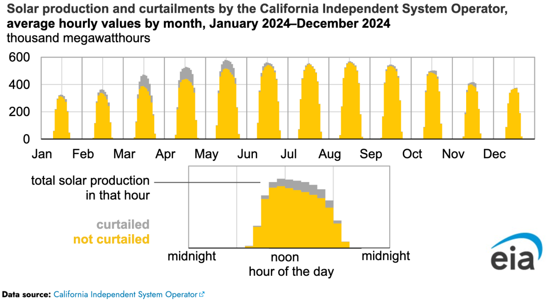 2024 年CAISO 削減了 340 萬兆瓦時的公用事業(yè)規(guī)模風能和太陽能發(fā)電,比 2023 年削減的電量增加了 29%。太陽能占 2024 年 CAISO 削減總電量的 93%。CAISO 在春季削減的太陽能最多,當時太陽能發(fā)電量相對較高,而用電需求相對較低,因為溫和的春季氣溫意味著對空間供暖或空調的需求較少。