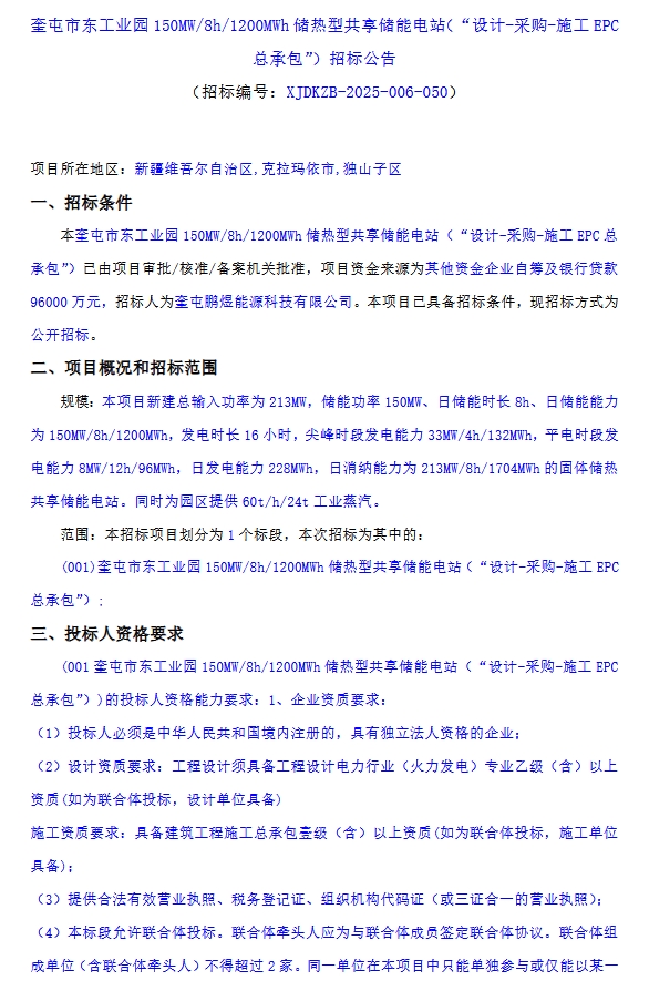 中國儲能網(wǎng)訊:6月7日,奎屯鵬煜能源科技有限公司發(fā)布了奎屯市東工業(yè)園150MW/8h/1200MWh儲熱型共享儲能電站(“設(shè)計-采購-施工EPC總承包”)招標(biāo)公告。