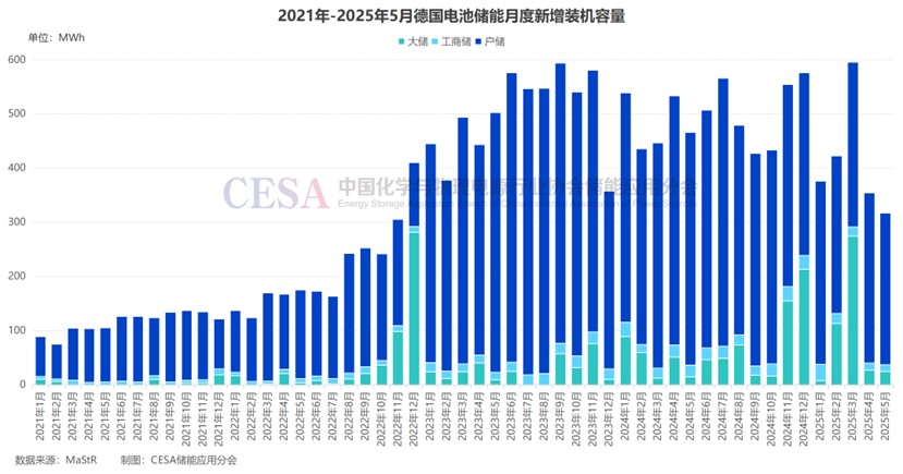2025年1-5月,德國電池儲能新增裝機1.273GW/2.064GWh,規(guī)模同比-21.32%(功率)/-14.71%(容量)。