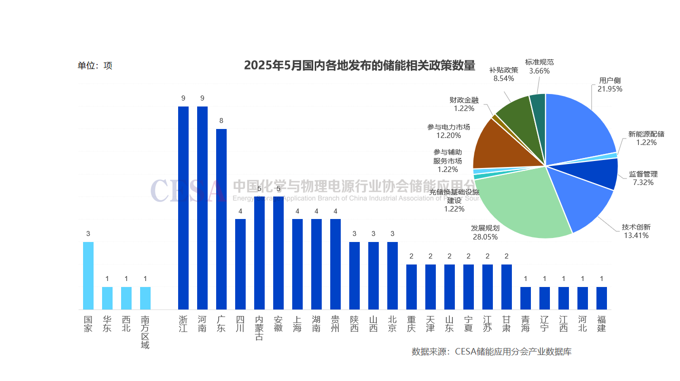 中國(guó)儲(chǔ)能網(wǎng)訊:據(jù)CESA儲(chǔ)能應(yīng)用分會(huì)產(chǎn)業(yè)數(shù)據(jù)庫(kù)不完全統(tǒng)計(jì),2025年5月份共發(fā)布儲(chǔ)能相關(guān)政策85項(xiàng),其中國(guó)家層面發(fā)布3項(xiàng),財(cái)政金融、技術(shù)創(chuàng)新、新能源配儲(chǔ)各有1項(xiàng)。