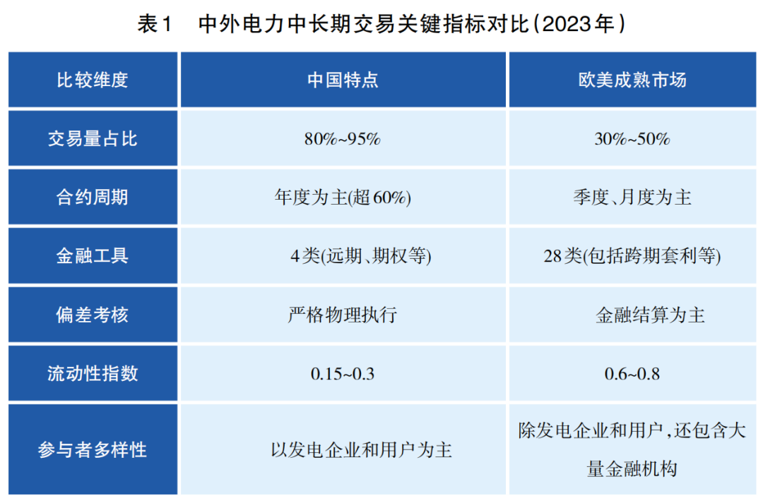 全球電力市場(chǎng)的多樣性為中長(zhǎng)期交易提供了豐富的實(shí)踐樣本,中外電力中長(zhǎng)期交易也各有不同。中國(guó)以“穩(wěn)中求進(jìn)”的漸進(jìn)式改革構(gòu)建特色路徑,而歐美成熟市場(chǎng)則依托金融衍生品形成高流動(dòng)性生態(tài)。國(guó)內(nèi)外中長(zhǎng)期交易差異具體體現(xiàn)在三大方面(見(jiàn)表1)。