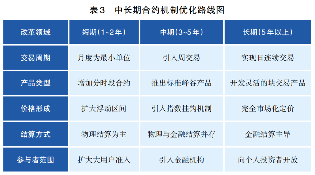 首先,中長(zhǎng)期合約機(jī)制有待進(jìn)一步優(yōu)化(見(jiàn)表3)。為推動(dòng)中長(zhǎng)期交易向更高水平發(fā)展,需要在以下三個(gè)方面進(jìn)行機(jī)制創(chuàng)新: